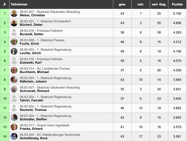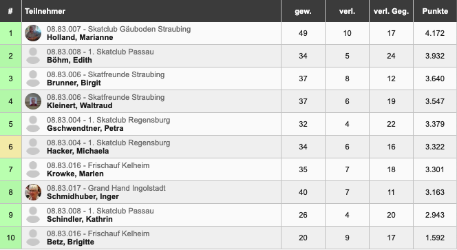 Zum Ende muss man konstatieren: Der Lauf des Skatclub Gäuboden Straubing hält unverändert an! Nach dem Sieg bei der Mannschaftsmeisterschaft holten sie sich auch den jeweils ersten Platz in allen drei Kategorien: